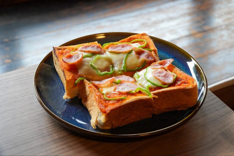 ピザトーストは、ちょっと懐かしい味。ウインナーにピーマン、玉ねぎ、そしてチーズ。トースターから出したてのパンが、カリッと音を立てる。