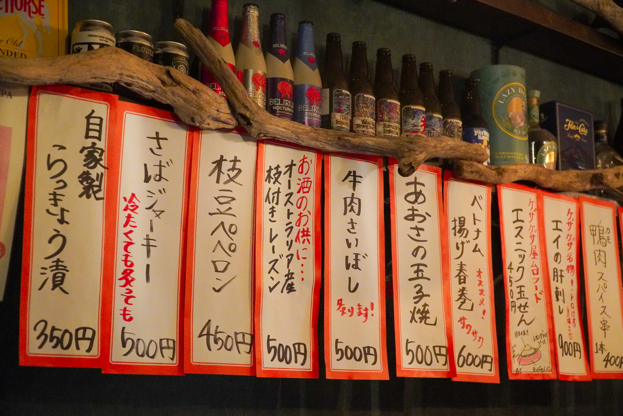 KezaKezaに来たら、まず壁を見る。その日のメニューは、短冊に手書きで吊るされている。仕入れや気分で少しずつ変わるのも、また楽しい。