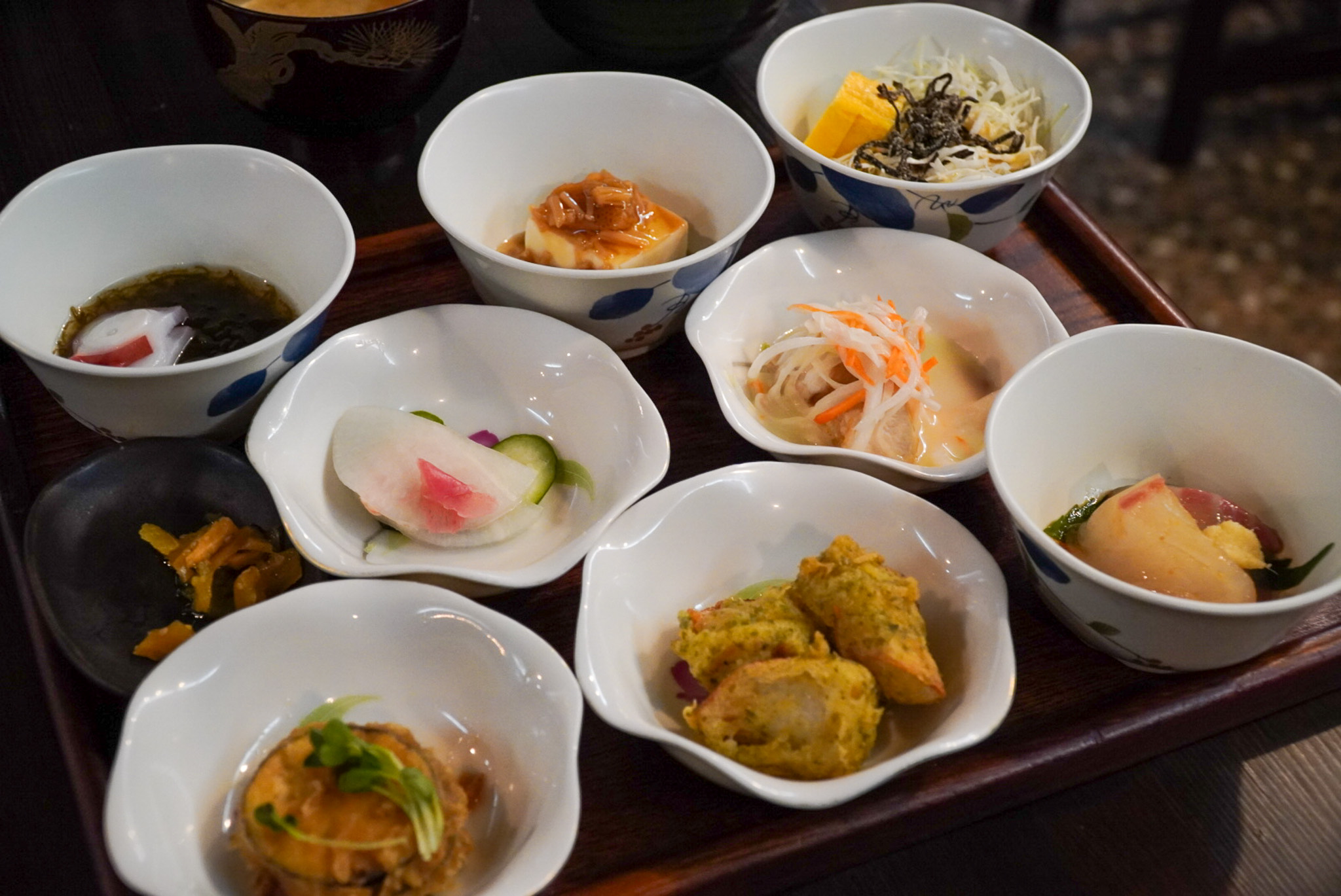 鯛のづけの上品な旨み、青のり香るちくわの磯辺揚げ、サクッと揚がったなすの挟み揚げ。酢の物、香の物、卵焼きと続く。どれも少しずつ、けれど一品ずつ丁寧に作られているのが伝わってくる。