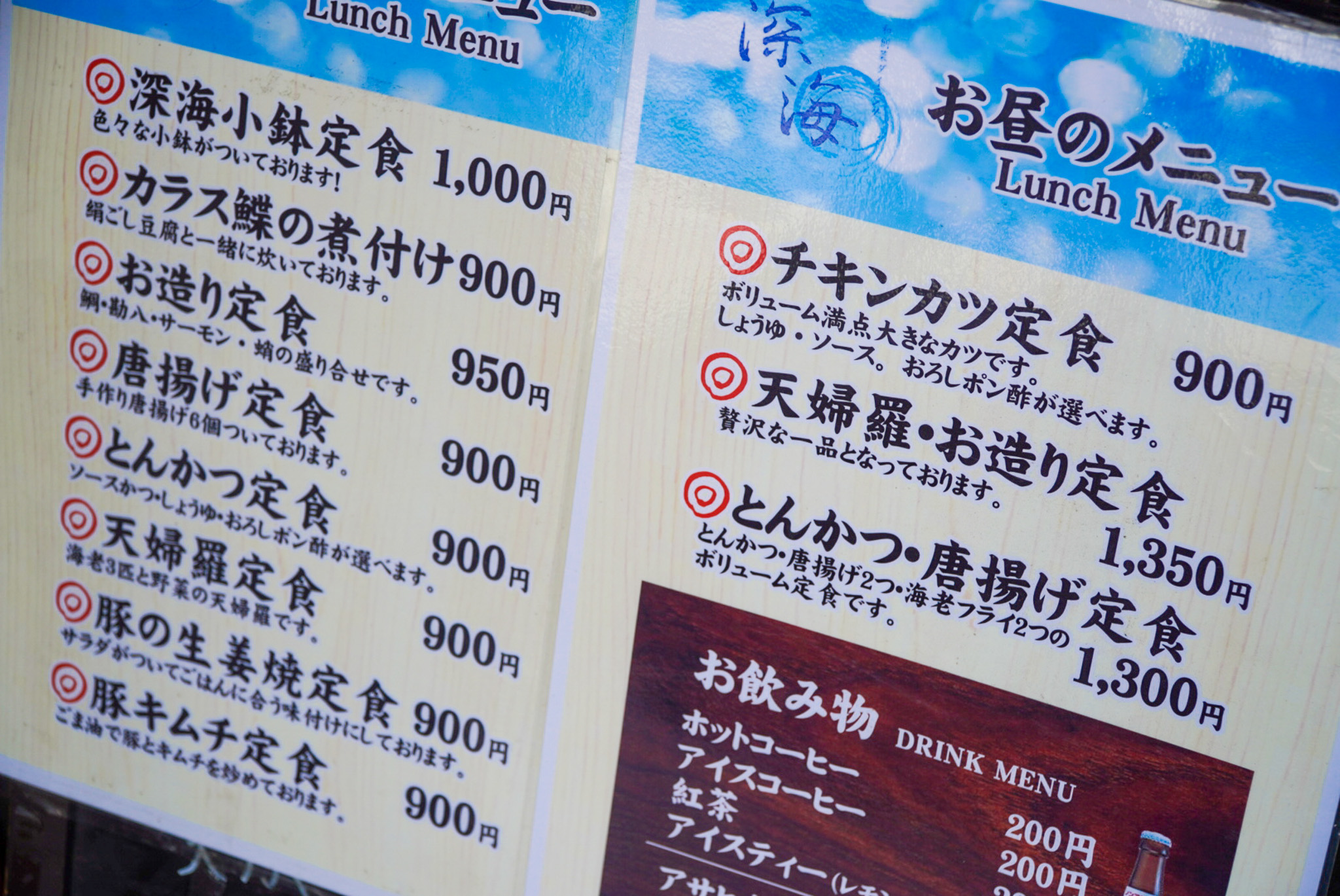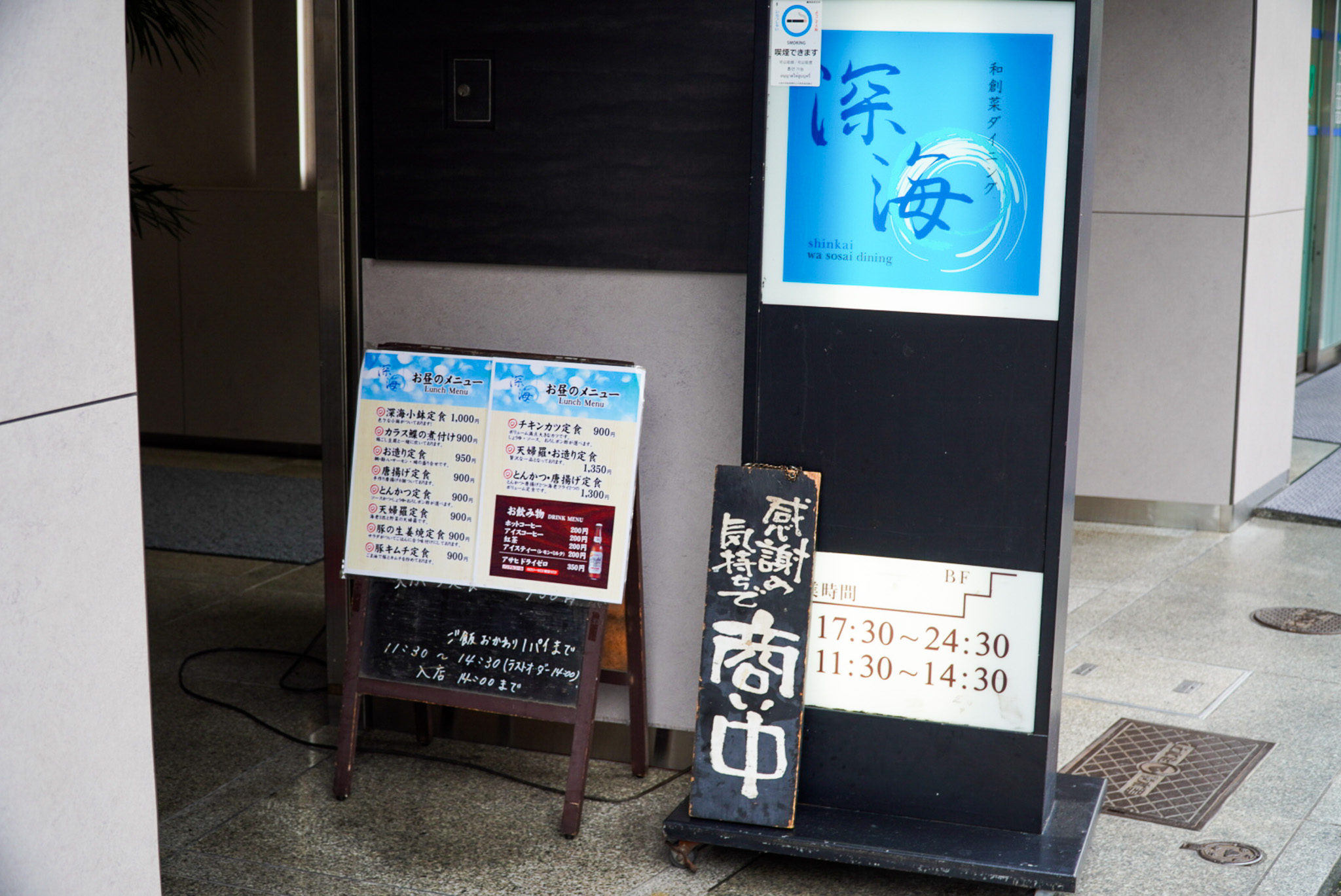 布施駅から歩いてすぐ。商店街の喧騒を少し外れたビルの地下1階にある「深海」。夜は焼酎を片手に魚をつつく大人の隠れ家だが、昼は一転、定食を求める人でいっぱいになる。