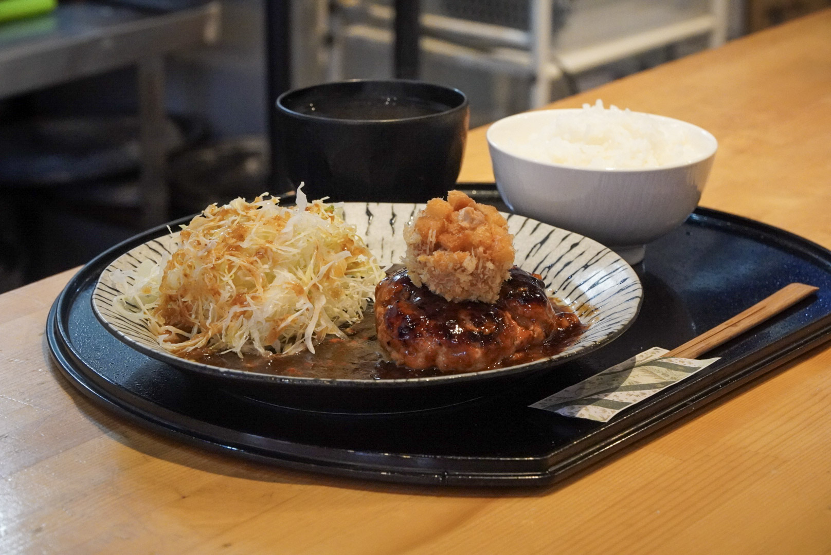 ハンバーグは、箸を入れると肉汁があふれる。その上には、ミニメンチカツがちょこんと乗っている。見た目はかわいらしいけれど、味は本格派。