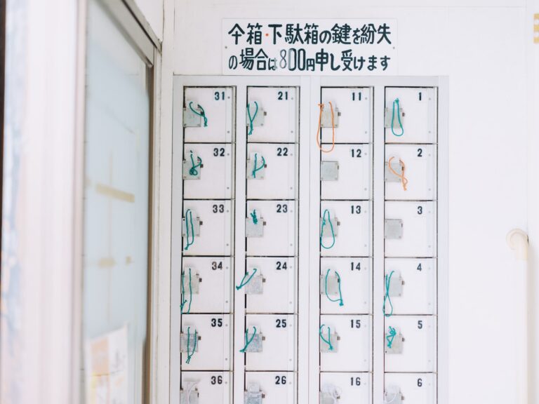 浴室に入ると、そこには時が止まったような空間がある。赤と青のボタンが並ぶ蛇口。タイルの壁。年季の入った木製のロッカー。