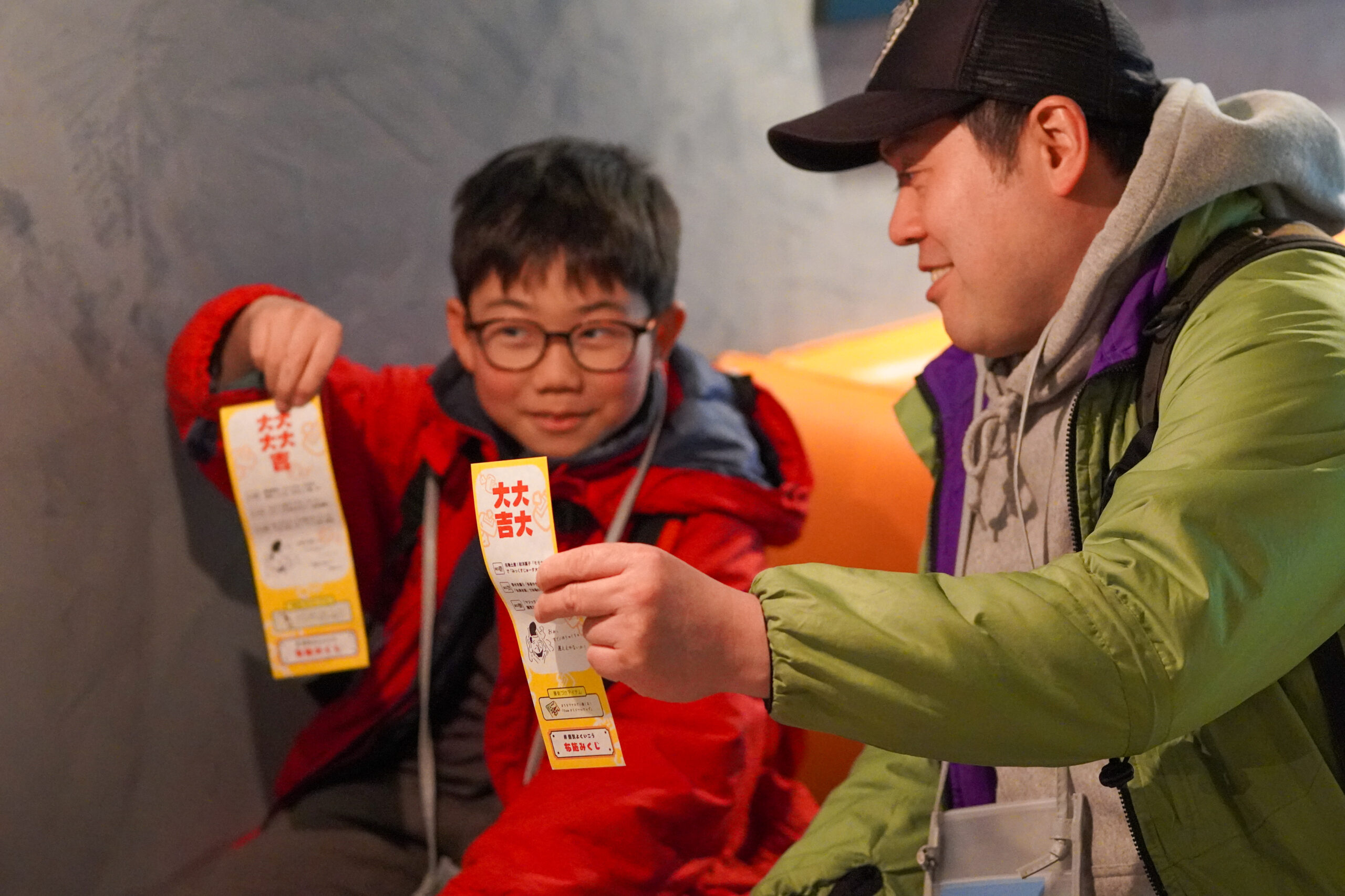 さらに、SEKAI HOTELオリジナルのおみくじを引いて、圭藤くんも「みてみて!」と嬉しそうな表情。気づけばすっかり“旅行者の顔”になっています。