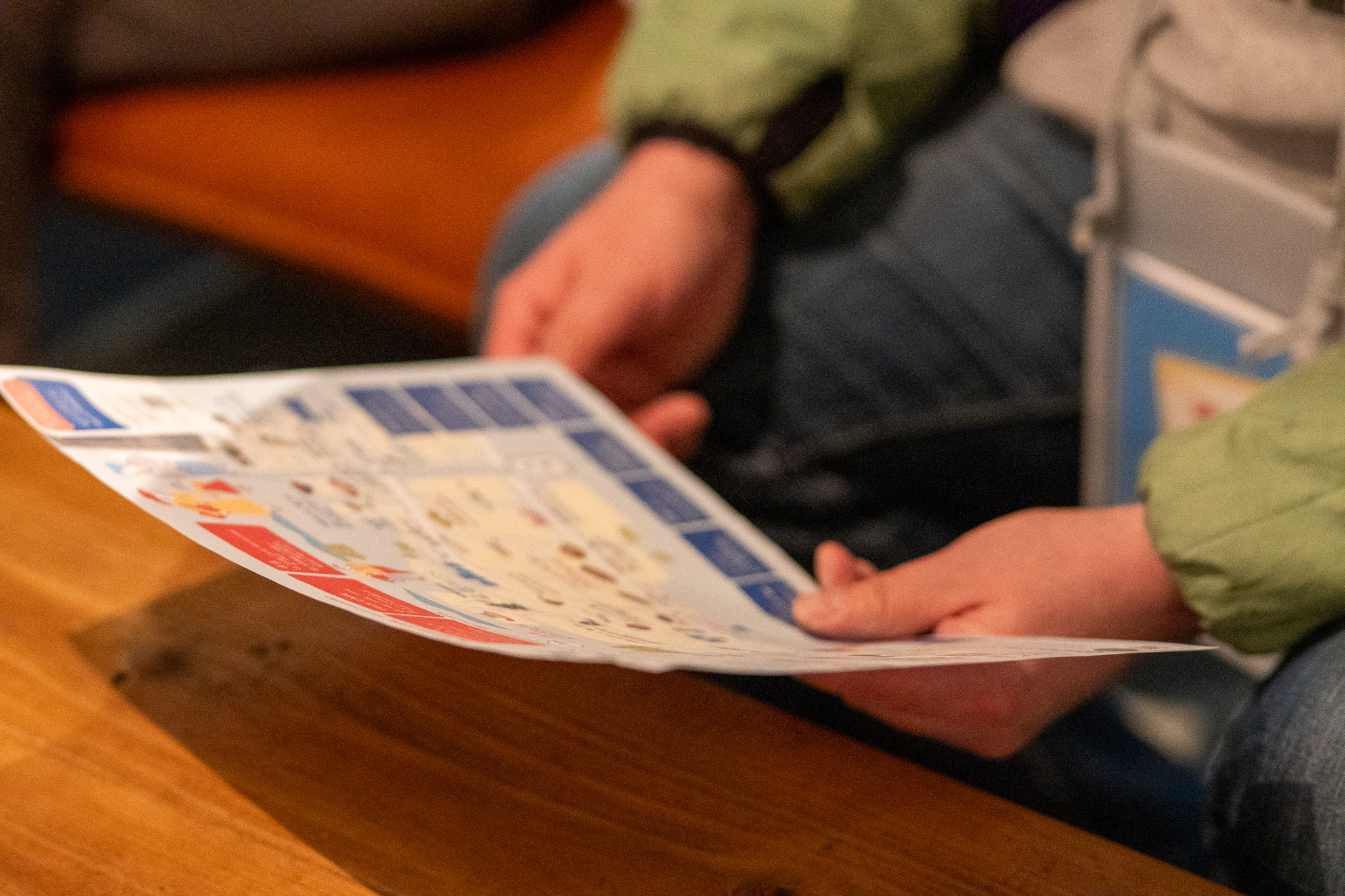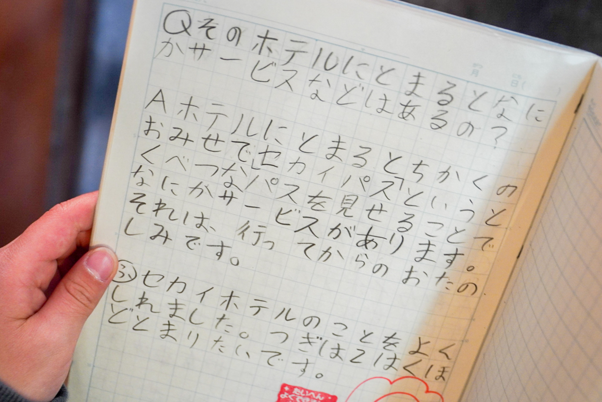 お仕事終わりの寺田さんご夫婦と、英語塾終わりで少しお疲れ気味の圭藤くんがフロントに到着。いつもは迎える側の皆さんが、首から宿泊者専用のSEKAI PASSを下げて立っている姿は、どこか新鮮です。