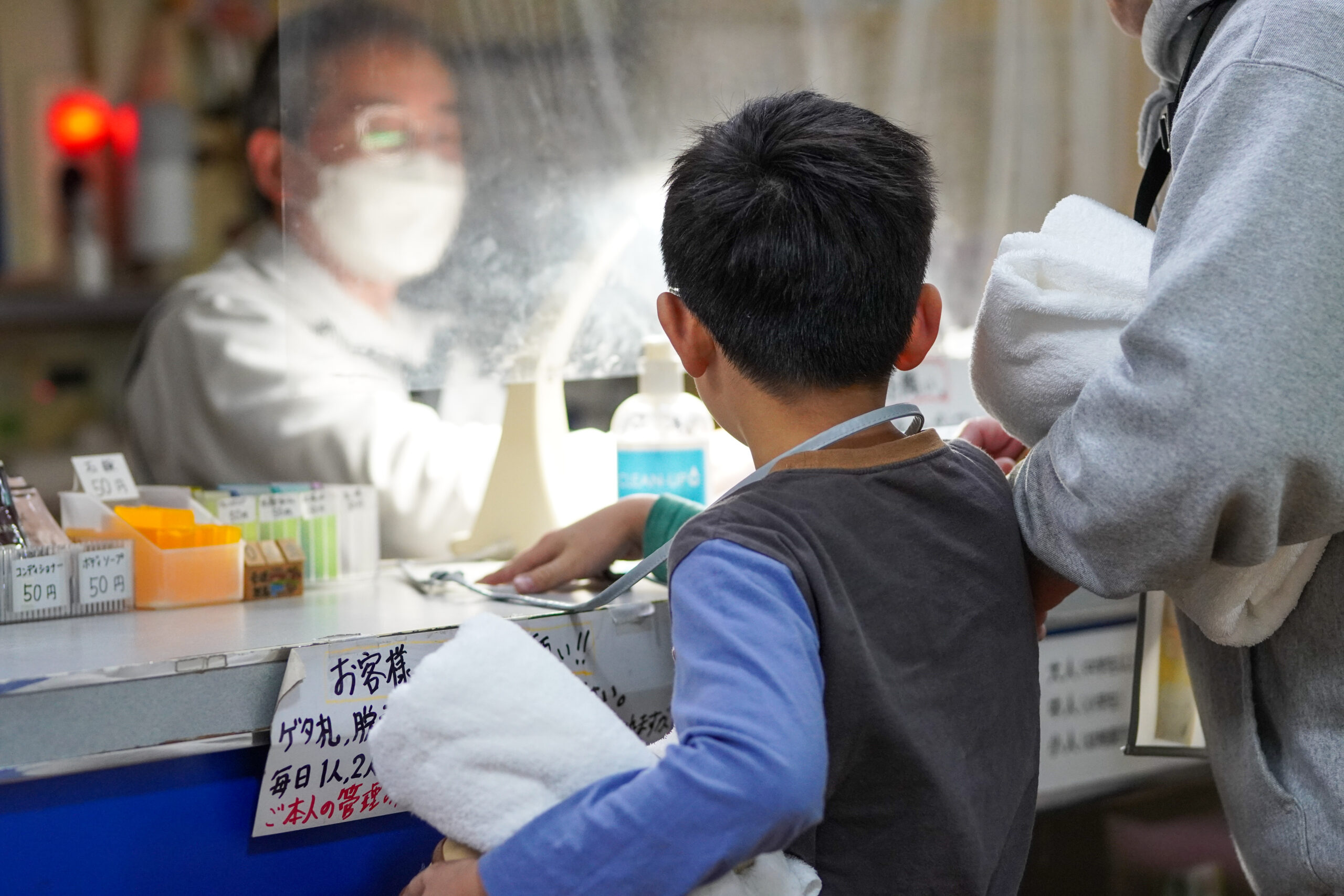 食事のあとは、もうひとつのお楽しみ。銭湯「戎湯」へ向かいます。近所の銭湯には行くものの、戎湯は初体験という圭藤くん。「楽しみにしててん!」と、足取りも軽やかです。